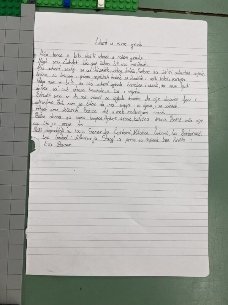 Imali smo zanimljiv zadatak u sklopu projekta Iza zidova na satu tehničke kulture u sedmom razredu. Kako smo bili zadnji dan u školi pred kraj 1. polugodišta na satu tehničke kulture osmislili smo naš advent u gradu uz pomoć lego kockica, kroz igru i maštu. Zadatak nam je bio maštovitost i osmišljavanje što bi bilo zanimljivo nama djeci u našem gradu. Meni kao nastavnici je bilo zanimljivo promatrati njihovu kreativnost u osmišljavanju adventa i njihovo prezentiranje. Budući je učenicima bio zadnji dan htjela sam im pružiti da se kroz igranje uvedu u blagdansko ozračje Božića. Nije ovo samo bila igra, nego razvijanje njihove kreativnosti i načina predstavljanja onoga što su osmislili. Bilo je tu i kućica s hranom, klizališta, zoološkog vrta, vrtuljka, kotač za razgled grada…Pogledajte sami što su osmislili: