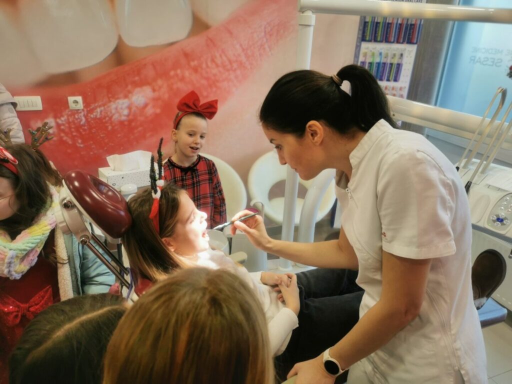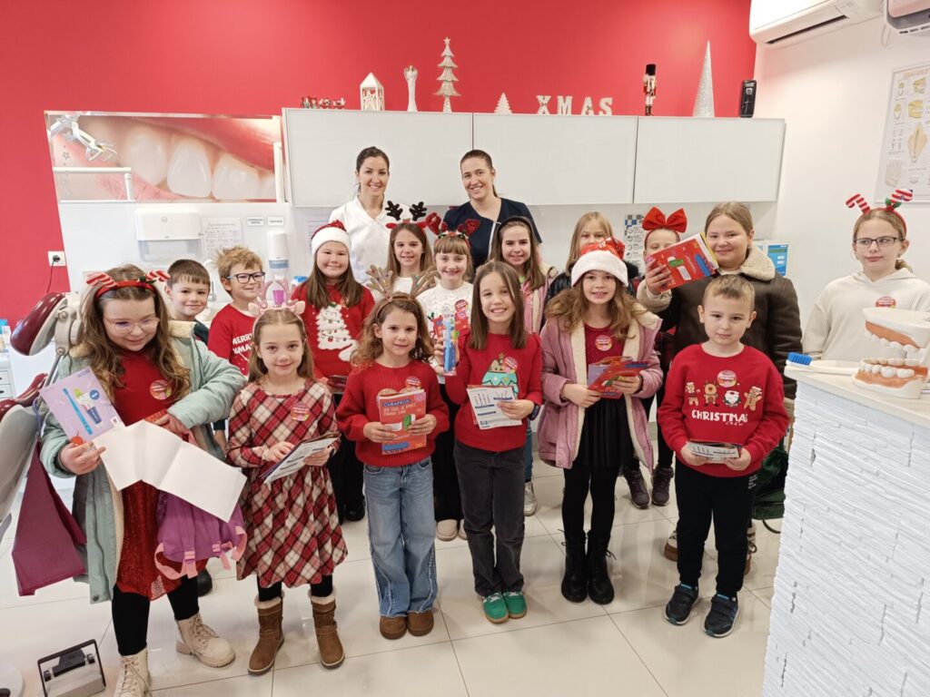 Prije odlaska na školski sajam posjetili smo stomatološku ordinaciju dr. Ivane Borčić Sesar. Stomatologinja je kroz ugodan razgovor s djecom istaknula važnost oralne higijene prvenstveno kako bi kod djece smanjila strah ali potaknula brigu o zdravlju zubi. Djeca su slušala i o tome kako se pravilno hraniti te što je zdravo za pravilan rast i razvoj zubi. Gledali su instrumente, ponovili znanje o četkanju zubi, a stomatologinja je na zabavan način objasnila kako pravilno brinuti o zubima i zašto su redoviti posjeti stomatologu važni. Kroz ugodan razgovor i pregled zubi djeca su se opustila i shvatila da posjet zubaru nije strašan. Ovaj posjet je važan zbog podizanja svijesti o zdravlju zubi i važnosti prevencije koja je ključna. Na kaju ugodnog druženja stomatologinja je djeci poklonila male paste i četkice za zube te medalju za hrabrost.