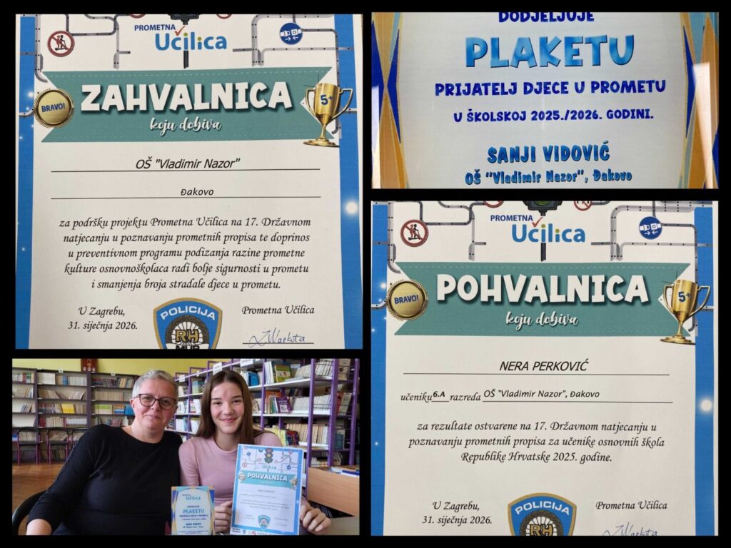 Učenica 6.a razreda, Nera Perković, postigla je 3737,25 bodova na 17. državnom Natjecanju u poznavanju prometnih propisa na Prometnoj Učilici i postigla 63. mjesto u državi. Naša škola postigla je 25. mjesto u ukupnom poretku, što je odličan uspjeh. Ukupno se uključilo 297 učenika naše škole u edukaciju prometnih propisa Prometna učilica.